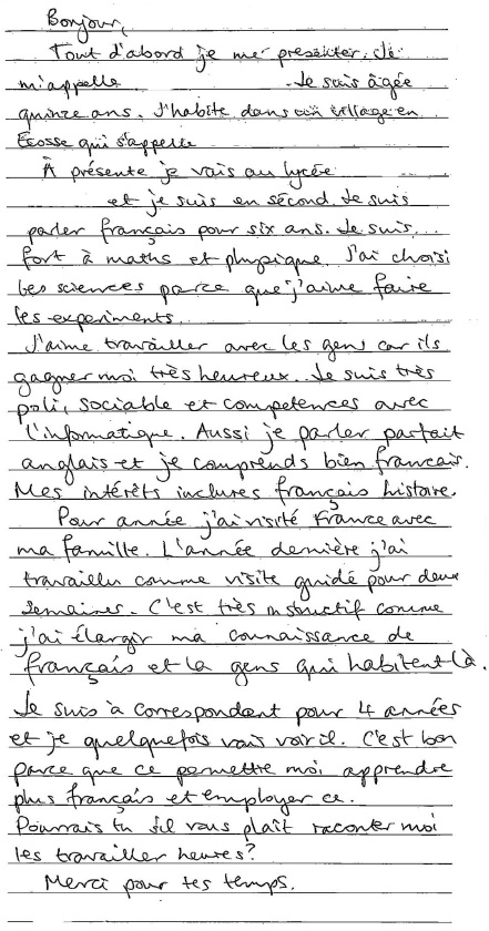 The job advert has been addressed fairly competently. The candidate makes limited use of detailed language. The language is fairly repetitive and uses a limited range of verbs and fixed phrases, eg I like, I go, I play.