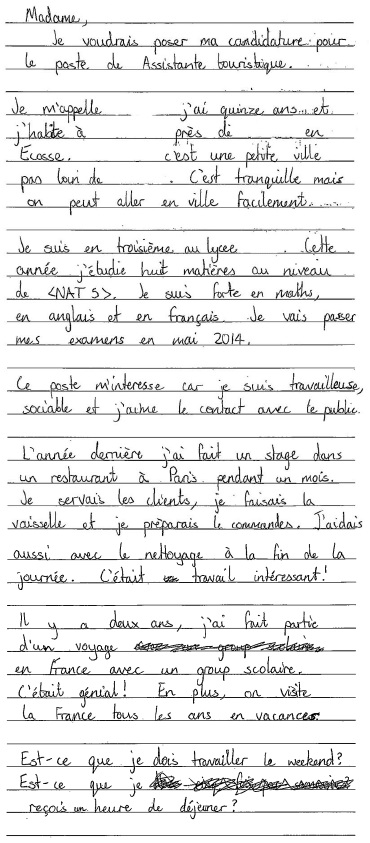 The job advert has been addressed fairly competently. The candidate makes limited use of detailed language. The language is fairly repetitive and uses a limited range of verbs and fixed phrases, eg I like, I go, I play.