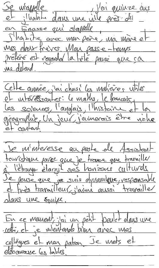 The job advert has been addressed fairly competently. The candidate makes limited use of detailed language. The language is fairly repetitive and uses a limited range of verbs and fixed phrases, eg I like, I go, I play.